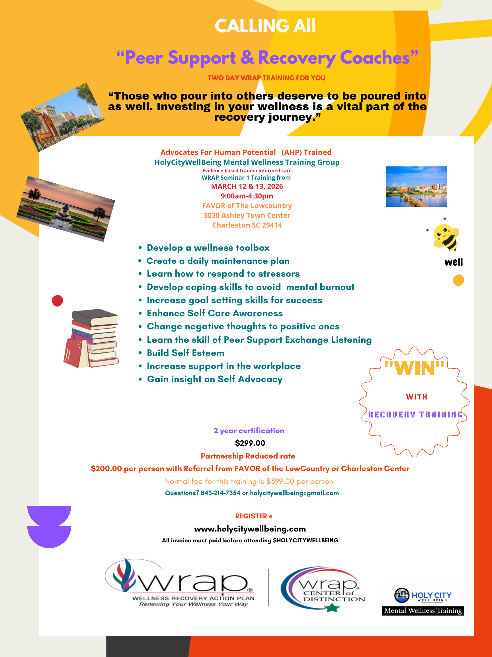 The person taking WRAP is the one who develops their own WRAP. However, the person may choose to have supporters, including health care professionals, to help them create their WRAP, but the individual remains in control of the process. Individuals learn to use WRAP® through a peer-led and peer-engaged group process. WRAP® co-facilitated peer-based groups were studied through randomized control trial studies and demonstrated to significantly improve one's wellness. Holy City Well Being Mental Wellness training group focuses on providing WRAP groups with fidelity to the evidence-based practices. We provide training and certification building networks of co-facilitators to expand access with fidelity to the practices that work best for people. WRAP® and Wellness Recovery Action Plan® are registered trademarks of Advocates for Human Potential, Inc. AHP.